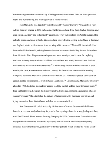 7roadmap for generations of brewers by offering products that differed from the mass-produced lagers and by mentoring and offering advice to future brewers.Jack McAuliffe was decidedly not influenced by Anchor Brewery.23 McAuliffe%u2019s New Albion Brewery opened in 1976 in Sonoma, California, an hour drive from Anchor Brewing, and used repurposed dairy and soda industry equipment. Truly independent, McAuliffe recreated the pale ale, porter, and stout styles he discovered and enjoyed while serving in the Navy in Scotland and England, styles he first started homebrewing while overseas.24 McAuliffe hand-bottled his beer and self-distributed it, driving between bars and restaurants in the Bay Area to deliver beer from his trunk. Since his products and operations were so unique, and because he explicitly marketed brewery tours so visitors could see how the beer was made, interested beer drinkers flocked to his old fruit warehouse brewery.25 After visiting Anchor Brewing and New AlbionBrewery in 1978, Ken Grossman and Paul Camusi, the founders of Sierra Nevada Brewing Company, noted that McAuliffe%u2019s brewery worked with %u201c[a] little elbow grease, some start-up capital, [and] a willingness [...] work tortuous [sic] hours.%u201d26 Unfortunately, McAuliffe%u2019s brewery closed in 1983 due to too much elbow grease, too little capital, and too many torturous hours.27Fred Eckhardt wrote, however, his legacy was already in place, inspiring a generation of do-ityourself brewers.28 He established the pattern of being inspired by European beer styles and trying to emulate them, first at home and then on a commercial level.Ken Grossman felt called to beer by his first taste of Anchor Steam which led him to homebrew beer and study chemistry for years before opening a homebrew supply shop and then, with Paul Camusi, Sierra Nevada Brewing Company in 1979. Grossman and Camusi were the first generation of brewers influenced by Maytag and McAuliffe, and would subsequently influence many other brewers, particularly with their pale ale, which created the %u201cWest Coast%u201d