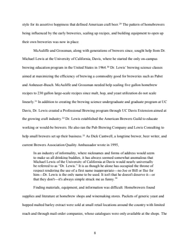 8style for its assertive hoppiness that defined American craft beer.29 The pattern of homebrewers being influenced by the early breweries, scaling up recipes, and building equipment to open up their own breweries was now in place.McAuliffe and Grossman, along with generations of brewers since, sought help from Dr. Michael Lewis at the University of California, Davis, where he started the only on-campus brewing education program in the United States in 1964.30 Dr. Lewis%u2019 brewing science classes aimed at maximizing the efficiency of brewing a commodity good for breweries such as Pabst and Anheuser-Busch. McAuliffe and Grossman needed help scaling five gallon homebrew recipes to 230 gallon large-scale recipes since malt, hop, and yeast utilization do not scale linearly.31 In addition to creating the brewing science undergraduate and graduate program at UC Davis, Dr. Lewis created a Professional Brewing program through UC Davis Extension aimed at the growing craft industry.32 Dr. Lewis established the American Brewers Guild to educate working or would-be brewers. He also ran the Pub Brewing Company and Lewis Consulting to help small brewers set up their business.33 As Dick Cantwell, a longtime brewer, beer writer, and current Brewers Association Quality Ambassador wrote in 1995,In an industry of informality, where nicknames and forms of address would seem to make us all drinking buddies, it has always seemed somewhat anomalous that Michael Lewis of the University of California at Davis would nearly universally be referred to as %u201cDr. Lewis.%u201d It is as though he alone has occupied the throne of respect rendering the use of a first name inappropriate%u2014no Joe or Bill or Ilse for him%u2014Dr. Lewis is the only name to be used. It isn't that he doesn't deserve it%u2014or that they don't%u2014it's always simple struck me as funny.34 Finding materials, equipment, and information was difficult. Homebrewers found supplies and literature at homebrew shops and winemaking stores. Packets of generic yeast and hopped malted barley extract were sold at small retail locations around the country with limited reach and through mail-order companies, whose catalogues were only available at the shops. The