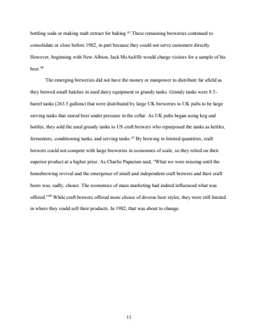 11bottling soda or making malt extract for baking.45 These remaining breweries continued to consolidate or close before 1982, in part because they could not serve customers directly. However, beginning with New Albion, Jack McAuliffe would charge visitors for a sample of his beer.46The emerging breweries did not have the money or manpower to distribute far afield as they brewed small batches in used dairy equipment or grundy tanks. Grundy tanks were 8.5-barrel tanks (263.5 gallons) that were distributed by large UK breweries to UK pubs to be large serving tanks that stored beer under pressure in the cellar. As UK pubs began using keg and bottles, they sold the used grundy tanks to US craft brewers who repurposed the tanks as kettles, fermenters, conditioning tanks, and serving tanks.47 By brewing in limited quantities, craft brewers could not compete with large breweries in economies of scale, so they relied on their superior product at a higher price. As Charlie Papazian said, %u201cWhat we were missing until the homebrewing revival and the emergence of small and independent craft brewers and their craft beers was, sadly, choice. The economics of mass marketing had indeed influenced what was offered.%u201d48 While craft brewers offered more choice of diverse beer styles, they were still limited in where they could sell their products. In 1982, that was about to change.