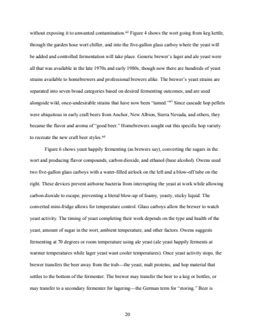 20without exposing it to unwanted contamination.62 Figure 4 shows the wort going from keg kettle, through the garden hose wort chiller, and into the five-gallon glass carboy where the yeast will be added and controlled fermentation will take place. Generic brewer%u2019s lager and ale yeast wereall that was available in the late 1970s and early 1980s, though now there are hundreds of yeast strains available to homebrewers and professional brewers alike. The brewer%u2019s yeast strains are separated into seven broad categories based on desired fermenting outcomes, and are used alongside wild, once-undesirable strains that have now been %u201ctamed.%u201d63 Since cascade hop pellets were ubiquitous in early craft beers from Anchor, New Albion, Sierra Nevada, and others, they became the flavor and aroma of %u201cgood beer.%u201d Homebrewers sought out this specific hop variety to recreate the new craft beer styles.64Figure 6 shows yeast happily fermenting (as brewers say), converting the sugars in the wort and producing flavor compounds, carbon dioxide, and ethanol (base alcohol). Owens used two five-gallon glass carboys with a water-filled airlock on the left and a blow-off tube on the right. These devices prevent airborne bacteria from interrupting the yeast at work while allowing carbon dioxide to escape, preventing a literal blow-up of foamy, yeasty, sticky liquid. The converted mini-fridge allows for temperature control. Glass carboys allow the brewer to watch yeast activity. The timing of yeast completing their work depends on the type and health of the yeast, amount of sugar in the wort, ambient temperature, and other factors. Owens suggests fermenting at 70 degrees or room temperature using ale yeast (ale yeast happily ferments at warmer temperatures while lager yeast want cooler temperatures). Once yeast activity stops, the brewer transfers the beer away from the trub%u2014the yeast, malt proteins, and hop material that settles to the bottom of the fermenter. The brewer may transfer the beer to a keg or bottles, or may transfer to a secondary fermenter for lagering%u2014the German term for %u201cstoring.%u201d Beer is
