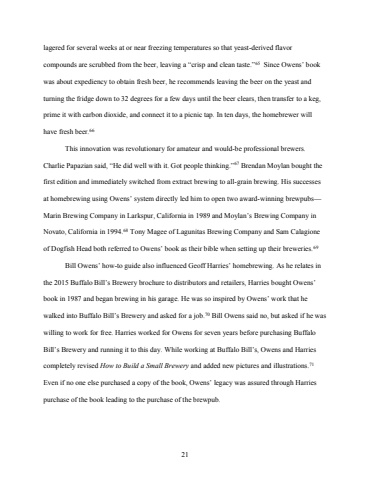 21lagered for several weeks at or near freezing temperatures so that yeast-derived flavor compounds are scrubbed from the beer, leaving a %u201ccrisp and clean taste.%u201d65 Since Owens%u2019 book was about expediency to obtain fresh beer, he recommends leaving the beer on the yeast and turning the fridge down to 32 degrees for a few days until the beer clears, then transfer to a keg, prime it with carbon dioxide, and connect it to a picnic tap. In ten days, the homebrewer will have fresh beer.66This innovation was revolutionary for amateur and would-be professional brewers. Charlie Papazian said, %u201cHe did well with it. Got people thinking.%u201d67 Brendan Moylan bought the first edition and immediately switched from extract brewing to all-grain brewing. His successes at homebrewing using Owens%u2019 system directly led him to open two award-winning brewpubs%u2014Marin Brewing Company in Larkspur, California in 1989 and Moylan%u2019s Brewing Company in Novato, California in 1994.68 Tony Magee of Lagunitas Brewing Company and Sam Calagione of Dogfish Head both referred to Owens%u2019 book as their bible when setting up their breweries.69Bill Owens%u2019 how-to guide also influenced Geoff Harries%u2019 homebrewing. As he relates in the 2015 Buffalo Bill%u2019s Brewery brochure to distributors and retailers, Harries bought Owens%u2019 book in 1987 and began brewing in his garage. He was so inspired by Owens%u2019 work that he walked into Buffalo Bill%u2019s Brewery and asked for a job.70 Bill Owens said no, but asked if he was willing to work for free. Harries worked for Owens for seven years before purchasing Buffalo Bill%u2019s Brewery and running it to this day. While working at Buffalo Bill%u2019s, Owens and Harries completely revised How to Build a Small Brewery and added new pictures and illustrations.71Even if no one else purchased a copy of the book, Owens%u2019 legacy was assured through Harries purchase of the book leading to the purchase of the brewpub.