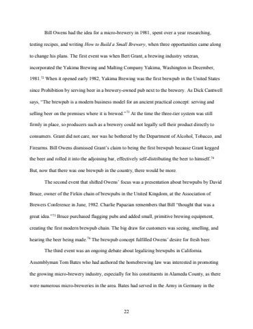 22Bill Owens had the idea for a micro-brewery in 1981, spent over a year researching, testing recipes, and writing How to Build a Small Brewery, when three opportunities came along to change his plans. The first event was when Bert Grant, a brewing industry veteran, incorporated the Yakima Brewing and Malting Company Yakima, Washington in December, 1981.72 When it opened early 1982, Yakima Brewing was the first brewpub in the United States since Prohibition by serving beer in a brewery-owned pub next to the brewery. As Dick Cantwell says, %u201cThe brewpub is a modern business model for an ancient practical concept: serving and selling beer on the premises where it is brewed.%u201d73 At the time the three-tier system was still firmly in place, so producers such as a brewery could not legally sell their product directly to consumers. Grant did not care, nor was he bothered by the Department of Alcohol, Tobacco, and Firearms. Bill Owens dismissed Grant%u2019s claim to being the first brewpub because Grant kegged the beer and rolled it into the adjoining bar, effectively self-distributing the beer to himself.74But, now that there was one brewpub in the country, there would be more.The second event that shifted Owens%u2019 focus was a presentation about brewpubs by David Bruce, owner of the Firkin chain of brewpubs in the United Kingdom, at the Association of Brewers Conference in June, 1982. Charlie Papazian remembers that Bill %u201cthought that was a great idea.%u201d75 Bruce purchased flagging pubs and added small, primitive brewing equipment, creating the first modern brewpub chain. The big draw for customers was seeing, smelling, and hearing the beer being made.76 The brewpub concept fulfilled Owens%u2019 desire for fresh beer.The third event was an ongoing debate about legalizing brewpubs in California. Assemblyman Tom Bates who had authored the homebrewing law was interested in promoting the growing micro-brewery industry, especially for his constituents in Alameda County, as there were numerous micro-breweries in the area. Bates had served in the Army in Germany in the