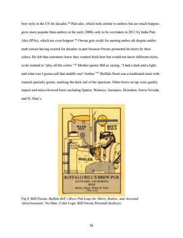 26beer style in the US for decades.90 Pale ales, which look similar to ambers but are much hoppier, grew more popular than ambers in the early 2000s only to be overtaken in 2011 by India Pale Ales (IPAs), which are even hoppier.91 Owens gets credit for naming amber ale despite amber malt extract having existed for decades in part because Owens promoted his beers by their colors. He felt that customers knew they wanted fresh beer but would not know different styles, so he wanted to %u201cplay all the colors.%u201d92 Mosher quotes Bill as saying, %u201cI had a dark and a light, and what was I gonna call that middle one? Amber.%u201d93 Buffalo Stout was a traditional stout with roasted specialty grains, marking the dark end of the spectrum. Other beers on tap were quality import and micro-brewed beers including Spaten, Watneys, Guinness, Heineken, Sierra Nevada, and St. Stan%u2019s.Fig 8. Bill Owens, Buffalo Bill%u2019s Brew Pub Logo for Shirts, Bottles, and Assorted Advertisements. No Date, Color Logo. Bill Owens Personal Archives.
