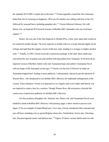 38the standard 20-25 IBUs of pale ales at the time.114 Owens arguably created the first American India Pale Ale by focusing on hoppiness. IPAs are the number one selling craft beer in the US, followed by seasonal beers including pumpkin ales.115 Owens followed Alimony Ale with Hearty Ale, an Imperial IPA brewed in honor of Buffalo Bill%u2019s bartender who survived heart surgery.116Hearty Ale was one of the first Imperial or Double IPAs, a beer style name that would not be coined for another decade. The term imperial or double refers to a recipe that has higher levels of hops and malt than the regular version of the beer style, leading to a stronger or higher alcohol style.117 Finally, in 1985, Owens received a mysterious package in the mail, three small cans, each about the size of peanut cans and stuffed with hop pellets from Tasmania. So he brewed an imperial version of Buffalo Amber with only Tasmanian hops and called it Tasmanian Devil with an image of the marsupial on the logo.118 Owens was the first US brewer to make anAustralian-hopped beer, leading to more publicity. Unfortunately, that press got the attention of Warner Bros., who threatened to sue Buffalo Bill%u2019s Brewery for trademark infringement of the Looney Tunes character. Owens was deposed in Los Angeles and swore under oath that he was not inspired to create a beer by a cartoon. Though Warner Bros. did not pursue a lawsuit this controversy created more publicity for Buffalo Bill%u2019s Brewery. All four products (Pumpkin Ale, Alimony Ale, Hearty Ale, and Tasmanian Devil) were bottled by hand at Buffalo Bill%u2019s Brewery with priming sugar, a labor-intensive process (see figure 19 for an example of hand-filling beer). Over time, Owens introduced other seasonal and one-off beers including wits or spiced Belgian wheat ales, Octoberfests, brown ales, Christmas ales, Russian imperial stouts, and barleywines.119 Figure 18 shows various labels used over the