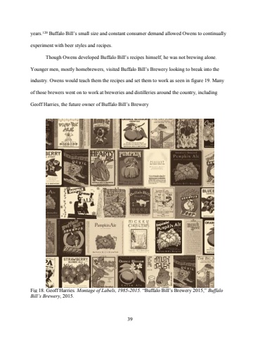 39years.120 Buffalo Bill%u2019s small size and constant consumer demand allowed Owens to continually experiment with beer styles and recipes.Though Owens developed Buffalo Bill%u2019s recipes himself, he was not brewing alone. Younger men, mostly homebrewers, visited Buffalo Bill%u2019s Brewery looking to break into the industry. Owens would teach them the recipes and set them to work as seen in figure 19. Many of those brewers went on to work at breweries and distilleries around the country, including Geoff Harries, the future owner of Buffalo Bill%u2019s BreweryFig 18. Geoff Harries. Montage of Labels, 1985-2015. %u201cBuffalo Bill%u2019s Brewery 2015,%u201d Buffalo Bill%u2019s Brewery, 2015.