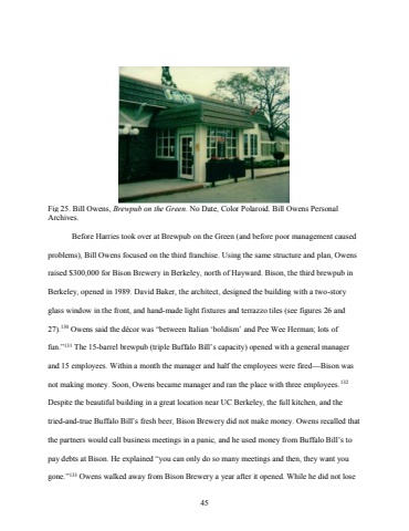 45Fig 25. Bill Owens, Brewpub on the Green. No Date, Color Polaroid. Bill Owens Personal Archives.Before Harries took over at Brewpub on the Green (and before poor management caused problems), Bill Owens focused on the third franchise. Using the same structure and plan, Owens raised $300,000 for Bison Brewery in Berkeley, north of Hayward. Bison, the third brewpub in Berkeley, opened in 1989. David Baker, the architect, designed the building with a two-story glass window in the front, and hand-made light fixtures and terrazzo tiles (see figures 26 and 27).130 Owens said the d%u00e9cor was %u201cbetween Italian %u2018boldism%u2019 and Pee Wee Herman; lots of fun.%u201d131 The 15-barrel brewpub (triple Buffalo Bill%u2019s capacity) opened with a general manager and 15 employees. Within a month the manager and half the employees were fired%u2014Bison was not making money. Soon, Owens became manager and ran the place with three employees.132Despite the beautiful building in a great location near UC Berkeley, the full kitchen, and the tried-and-true Buffalo Bill%u2019s fresh beer, Bison Brewery did not make money. Owens recalled that the partners would call business meetings in a panic, and he used money from Buffalo Bill%u2019s to pay debts at Bison. He explained %u201cyou can only do so many meetings and then, they want you gone.%u201d133 Owens walked away from Bison Brewery a year after it opened. While he did not lose