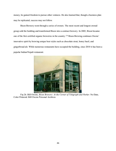 46money, he gained freedom to pursue other ventures. He also learned that, though a business plan may be replicated, success may not follow. Bison Brewery went through a series of owners. The most recent and longest-owned group sold the building and transformed Bison into a contract brewery. In 2003, Bison became one of the first certified organic breweries in the country.134 Bison Brewing continues Owens%u2019 innovative spirit by brewing unique beer styles such as chocolate stout, honey basil, and gingerbread ale. While numerous restaurants have occupied the building, since 2010 it has been a popular Indian/Nepali restaurant. Fig 26. Bill Owens, Bison Brewery: At the Corner of Telegraph and Parker. No Date, Color Polaroid. Bill Owens Personal Archives