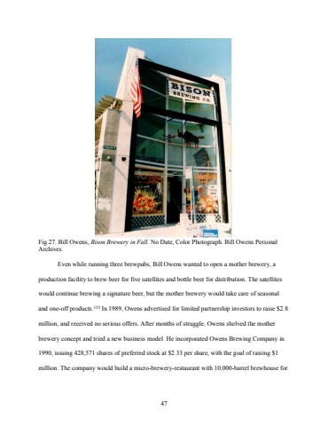 47Fig 27. Bill Owens, Bison Brewery in Fall. No Date, Color Photograph. Bill Owens Personal Archives.Even while running three brewpubs, Bill Owens wanted to open a mother brewery, a production facility to brew beer for five satellites and bottle beer for distribution. The satellites would continue brewing a signature beer, but the mother brewery would take care of seasonal and one-off products.135 In 1989, Owens advertised for limited partnership investors to raise $2.8 million, and received no serious offers. After months of struggle, Owens shelved the mother brewery concept and tried a new business model. He incorporated Owens Brewing Company in 1990, issuing 428,571 shares of preferred stock at $2.33 per share, with the goal of raising $1 million. The company would build a micro-brewery-restaurant with 10,000-barrel brewhouse for