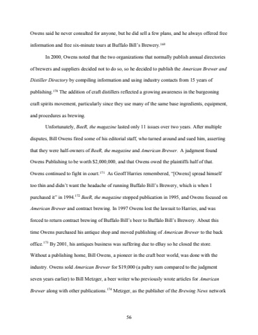 56Owens said he never consulted for anyone, but he did sell a few plans, and he always offered free information and free six-minute tours at Buffalo Bill%u2019s Brewery.169In 2000, Owens noted that the two organizations that normally publish annual directories of brewers and suppliers decided not to do so, so he decided to publish the American Brewer and Distiller Directory by compiling information and using industry contacts from 15 years of publishing.170 The addition of craft distillers reflected a growing awareness in the burgeoning craft spirits movement, particularly since they use many of the same base ingredients, equipment, and procedures as brewing. Unfortunately, BeeR, the magazine lasted only 11 issues over two years. After multiple disputes, Bill Owens fired some of his editorial staff, who turned around and sued him, asserting that they were half-owners of BeeR, the magazine and American Brewer. A judgment found Owens Publishing to be worth $2,000,000, and that Owens owed the plaintiffs half of that. Owens continued to fight in court.171 As Geoff Harries remembered, %u201c[Owens] spread himself too thin and didn%u2019t want the headache of running Buffalo Bill%u2019s Brewery, which is when I purchased it%u201d in 1994.172 BeeR, the magazine stopped publication in 1995, and Owens focused on American Brewer and contract brewing. In 1997 Owens lost the lawsuit to Harries, and was forced to return contract brewing of Buffalo Bill%u2019s beer to Buffalo Bill%u2019s Brewery. About this time Owens purchased his antique shop and moved publishing of American Brewer to the back office.173 By 2001, his antiques business was suffering due to eBay so he closed the store. Without a publishing home, Bill Owens, a pioneer in the craft beer world, was done with the industry. Owens sold American Brewer for $19,000 (a paltry sum compared to the judgment seven years earlier) to Bill Metzger, a beer writer who previously wrote articles for American Brewer along with other publications.174 Metzger, as the publisher of the Brewing News network