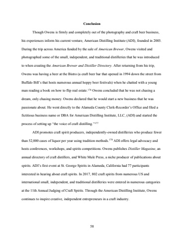 58ConclusionThough Owens is firmly and completely out of the photography and craft beer business, his experiences inform his current venture, American Distilling Institute (ADI), founded in 2003. During the trip across America funded by the sale of American Brewer, Owens visited and photographed some of the small, independent, and traditional distilleries that he was introduced to when creating the American Brewer and Distiller Directory. After returning from his trip, Owens was having a beer at the Bistro (a craft beer bar that opened in 1994 down the street from Buffalo Bill%u2019s that hosts numerous annual hoppy beer festivals) when he chatted with a young man reading a book on how to flip real estate.176 Owens concluded that he was not chasing a dream, only chasing money. Owens declared that he would start a new business that he was passionate about. He went directly to the Alameda County Clerk-Recorder%u2019s Office and filed a fictitious business name or DBA for American Distilling Institute, LLC, (ADI) and started the process of setting up %u201cthe voice of craft distilling.%u201d177ADI promotes craft spirit producers, independently-owned distilleries who produce fewer than 52,000 cases of liquor per year using tradition methods.178 ADI offers legal advocacy and hosts conferences, workshops, and spirits competitions. Owens publishes Distiller Magazine, an annual directory of craft distillers, and White Mule Press, a niche producer of publications about spirits. ADI%u2019s first event at St. George Spirits in Alameda, California had 77 participants interested in hearing about craft spirits. In 2017, 802 craft spirits from numerous US and international small, independent, and traditional distilleries were entered in numerous categories at the 11th Annual Judging of Craft Spirits. Through the American Distilling Institute, Owens continues to inspire creative, independent entrepreneurs in a craft industry.