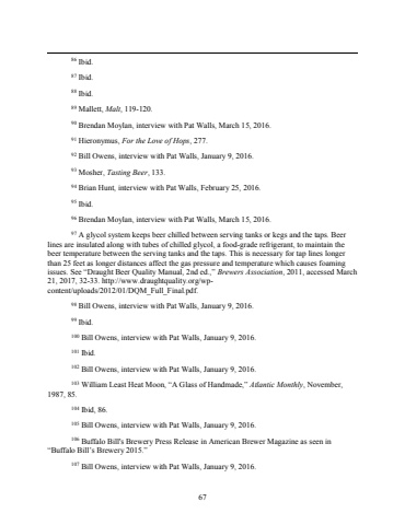 67 86 Ibid.87 Ibid.88 Ibid.89 Mallett, Malt, 119-120.90 Brendan Moylan, interview with Pat Walls, March 15, 2016.91 Hieronymus, For the Love of Hops, 277.92 Bill Owens, interview with Pat Walls, January 9, 2016.93 Mosher, Tasting Beer, 133.94 Brian Hunt, interview with Pat Walls, February 25, 2016.95 Ibid.96 Brendan Moylan, interview with Pat Walls, March 15, 2016.97 A glycol system keeps beer chilled between serving tanks or kegs and the taps. Beer lines are insulated along with tubes of chilled glycol, a food-grade refrigerant, to maintain the beer temperature between the serving tanks and the taps. This is necessary for tap lines longer than 25 feet as longer distances affect the gas pressure and temperature which causes foaming issues. See %u201cDraught Beer Quality Manual, 2nd ed.,%u201d Brewers Association, 2011, accessed March 21, 2017, 32-33. http://www.draughtquality.org/wpcontent/uploads/2012/01/DQM_Full_Final.pdf.98 Bill Owens, interview with Pat Walls, January 9, 2016.99 Ibid.100 Bill Owens, interview with Pat Walls, January 9, 2016.101 Ibid.102 Bill Owens, interview with Pat Walls, January 9, 2016.103 William Least Heat Moon, %u201cA Glass of Handmade,%u201d Atlantic Monthly, November, 1987, 85.104 Ibid, 86.105 Bill Owens, interview with Pat Walls, January 9, 2016.106 Buffalo Bill's Brewery Press Release in American Brewer Magazine as seen in %u201cBuffalo Bill%u2019s Brewery 2015.%u201d 107 Bill Owens, interview with Pat Walls, January 9, 2016.
