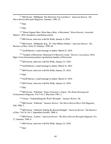 69 131 Bill Owens, %u201cBillSpeak: The Most Fun You Can Have,%u201d American Brewer: The Micro-Brewer/Brewpub Magazine, Summer, 1989, 52.132 Ibid.133 Ibid.134 %u201cBison Organic Beer: More than a Beer, a Movement,%u201d Bison Brewery. Accessed March 1, 2016. bisonbrew.com/themovement/.135 Bill Owens, interview with Pat Walls, January 9, 2016.136 Bill Owens, %u201cBillSpeak: Reg. %u2018D%u2019: One Million Dollars,%u201d American Brewer: The Business of Beer, Issue 45, Summer, 1990. 60.137 Geoff Harries, e-mail message to author, March 25, 2016.138 %u201cNumber of Breweries: Historical US Brewery Count,%u201d Brewers Association, 2016. https://www.brewersassociation.org/statistics/number-of-breweries/.139 Bill Owens, interview with Pat Walls, January 23, 2016.140 Geoff Harries, e-mail message to author, March 25, 2016.141 Bill Owens, interview with Pat Walls, January 23, 2016.142 Ibid.143 Geoff Harries, e-mail message to author, March 25, 2016. 144 Bill Owens, interview with Pat Walls, January 23, 2016.145 Ibid.146 Bill Owens, %u201cEditorial,%u201d Home Fermenter%u2019s Digest: The Home Brewing and Fermentation Magazine, Vol 5 No 3, May/June 1985, 2.147 Owens, %u201cTrademarking the Word %u2018Brewpub,%u2019 Amateur Brewer, 40.148 Bill Owens, %u201cEditorial,%u201d Amateur Brewer: The Micro-Brewer/Brew Pub Magazine, Fall, 1986, 5.149 Bill Owens, %u201cEditorial: Setting the Record Straight,%u201d American Brewer: The Business of Beer, Vol 16, No 3, September/October, 2000, 6.150 Bill Owens, %u201cLetters,%u201d American Brewer: The Micro-Brewer/Brewpub Magazine, No 37, Summer, 1988, 6.151 Bill Owens, interview with Pat Walls, January 23, 2016.152 Ibid.