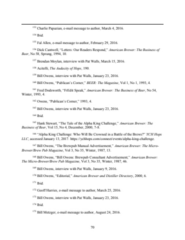 70 153 Charlie Papazian, e-mail message to author, March 4, 2016.154 Ibid.155 Fal Allen, e-mail message to author, February 29, 2016.156 Dick Cantwell, %u201cLetters: Our Readers Respond,%u201d American Brewer: The Business of Beer, No 58, Sprung, 1994, 10.157 Brendan Moylan, interview with Pat Walls, March 15, 2016.158 Acitelli, The Audacity of Hops, 190.159 Bill Owens, interview with Pat Walls, January 23, 2016.160 Bill Owens, %u201cPublican%u2019s Corner,%u201d BEER: The Magazine, Vol 1, No 1, 1993, 4.161 Fred Dodsworth, %u201cFrEdit Speak,%u201d American Brewer: The Business of Beer, No 54, Winter, 1993, 4.162 Owens, %u201cPublican%u2019s Corner,%u201d 1993, 4.163 Bill Owens, interview with Pat Walls, January 23, 2016.164 Ibid.165 Hank Stewart, %u201cThe Tale of the Alpha King Challenge,%u201d American Brewer: The Business of Beer, Vol 15, No 4, December, 2000, 7-8.166 %u201cAlpha King Challenge: Who Will Be Crowned in a Battle of the Brews?%u201d YCH Hops LLC, accessed January 13, 2017. https://ychhops.com/connect/events/alpha-king-challenge. 167 Bill Owens, %u201cThe Brewpub Manual Advertisement,%u201d American Brewer: The MicroBrewer/Brew Pub Magazine, Vol 3, No 35, Winter, 1987, 13.168 Bill Owens, %u201cBill Owens: Brewpub Consultant Advertisement,%u201d American Brewer: The Micro-Brewer/Brew Pub Magazine, Vol 3, No 35, Winter, 1987, 46.169 Bill Owens, interview with Pat Walls, January 9, 2016.170 Bill Owens, %u201cEditorial,%u201d American Brewer and Distiller Directory, 2000, 6.171 Ibid.172 Geoff Harries, e-mail message to author, March 25, 2016.173 Bill Owens, interview with Pat Walls, January 23, 2016.174 Ibid.175 Bill Metzger, e-mail message to author, August 24, 2016.