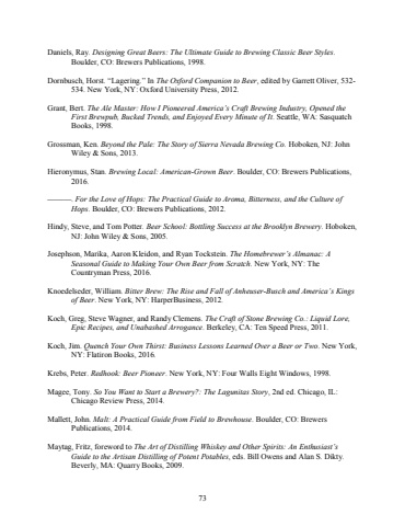73Daniels, Ray. Designing Great Beers: The Ultimate Guide to Brewing Classic Beer Styles. Boulder, CO: Brewers Publications, 1998.Dornbusch, Horst. %u201cLagering.%u201d In The Oxford Companion to Beer, edited by Garrett Oliver, 532-534. New York, NY: Oxford University Press, 2012.Grant, Bert. The Ale Master: How I Pioneered America%u2019s Craft Brewing Industry, Opened the First Brewpub, Bucked Trends, and Enjoyed Every Minute of It. Seattle, WA: Sasquatch Books, 1998.Grossman, Ken. Beyond the Pale: The Story of Sierra Nevada Brewing Co. Hoboken, NJ: John Wiley & Sons, 2013.Hieronymus, Stan. Brewing Local: American-Grown Beer. Boulder, CO: Brewers Publications, 2016.%u2014%u2014%u2014. For the Love of Hops: The Practical Guide to Aroma, Bitterness, and the Culture of Hops. Boulder, CO: Brewers Publications, 2012.Hindy, Steve, and Tom Potter. Beer School: Bottling Success at the Brooklyn Brewery. Hoboken, NJ: John Wiley & Sons, 2005.Josephson, Marika, Aaron Kleidon, and Ryan Tockstein. The Homebrewer%u2019s Almanac: A Seasonal Guide to Making Your Own Beer from Scratch. New York, NY: The Countryman Press, 2016.Knoedelseder, William. Bitter Bre The Rise and Fall of Anheuser-Busch and America%u2019s Kings of Beer. New York, NY: HarperBusiness, 2012.Koch, Greg, Steve Wagner, and Randy Clemens. The Craft of Stone Brewing Co.: Liquid Lore, Epic Recipes, and Unabashed Arrogance. Berkeley, CA: Ten Speed Press, 2011.Koch, Jim. Quench Your Own Thirst: Business Lessons Learned Over a Beer or Two. New York, NY: Flatiron Books, 2016.Krebs, Peter. Redhook: Beer Pioneer. New York, NY: Four Walls Eight Windows, 1998.Magee, Tony. So You Want to Start a Brewery?: The Lagunitas Story, 2nd ed. Chicago, IL: Chicago Review Press, 2014.Mallett, John. Malt: A Practical Guide from Field to Brewhouse. Boulder, CO: Brewers Publications, 2014.Maytag, Fritz, foreword to The Art of Distilling Whiskey and Other Spirits: An Enthusiast%u2019s Guide to the Artisan Distilling of Potent Potables, eds. Bill Owens and Alan S. Dikty.Beverly, MA: Quarry Books, 2009.