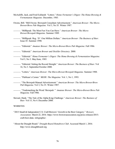 76McAuliffe, Jack, and Fred Eckhardt. %u201cLetters.%u201d Home Fermenter%u2019s Digest: The Home Brewing & Fermentation Magazine. December, 1985.Owens, Bill. %u201cBill Owens: Brewpub Consultant Advertisement.%u201d American Brewer: The MicroBrewer/Brew Pub Magazine. Vol 3, No 35. Winter 1987.%u2014%u2014%u2014. %u201cBillSpeak: The Most Fun You Can Have.%u201d American Brewer: The MicroBrewer/Brewpub Magazine. Summer 1989.%u2014%u2014%u2014. %u201cBillSpeak: Reg. %u2018D%u2019: One Million Dollars.%u201d American Brewer: The Business of Beer. Issue 45. Summer 1990.%u2014%u2014%u2014. %u201cEditorial.%u201d Amateur Brewer: The Micro-Brewer/Brew Pub Magazine. Fall 1986.%u2014%u2014%u2014. %u201cEditorial.%u201d American Brewer and Distiller Directory. 2000.%u2014%u2014%u2014. %u201cEditorial.%u201d Home Fermenter%u2019s Digest: The Home Brewing & Fermentation Magazine. Vol 5, No 3. May/June, 1985.%u2014%u2014%u2014. %u201cEditorial: Setting the Record Straight.%u201d American Brewer: The Business of Beer. Vol 16, No 3. September/October 2000.%u2014%u2014%u2014. %u201cLetters.%u201d American Brewer: The Micro-Brewer/Brewpub Magazine. Summer 1988.%u2014%u2014%u2014. %u201cPublican%u2019s Corner.%u201d BEER: The Magazine. Vol. 1, No 1, 1993.%u2014%u2014%u2014. %u201cThe Brewpub Manual Advertisement.%u201d American Brewer: The Micro-Brewer/Brew Pub Magazine. Vol 3, No 35. Winter 1987.%u2014%u2014%u2014. %u201cTrademarking the Word %u2018Brewpub.%u2019%u201d Amateur Brewer: The Micro-Brewer/Brew Pub Magazine. Fall 1986.Stewart, Hank. %u201cThe Tale of the Alpha King Challenge.%u201d American Brewer: The Business of Beer. Vol 15, No 4. December 2000.WEBSITES%u201c2015 Small & Independent U.S. Craft Brewers%u2019 Growth in the Beer Category.%u201d Brewers Association. March 22, 2016. https://www.brewersassociation.org/press-releases/2015-craft-beer-data- infographic/.%u201cAbout the Draught Board.%u201d Draught Board Homebrew Club. Accessed March 1, 2016. http://www.draughtboard.org.