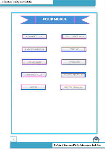 Momentum, Impuls, dan Tumbukan FITUR MODUL PENDAHULUAN KI / KD / INDIKATOR KATA PENGANTAR TUJUAN PETA KONSEP APERSEPSI MATERI BELAJAR 1 MATERI BELAJAR 2 COVER DAFTAR PUSTAKA i E – Modul Kontekstual Berbasis Permainan Tradisional