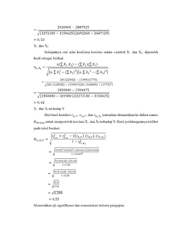 ℎ untuk memperoleh korelasi X1 dan X2 terhadap Y. Hasil perhitungannya terlihat