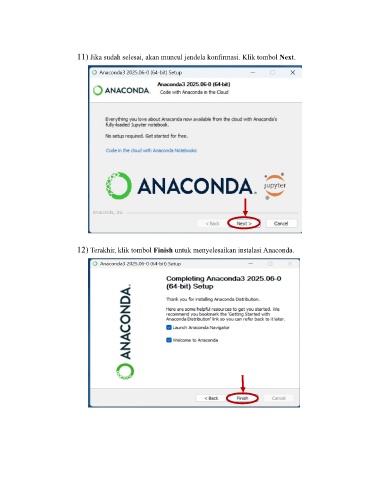 11) Jika sudah selesai, akan muncul jendela konfirmasi. Klik tombol Next. 12) Terakhir, klik tombol Finish untuk menyelesaikan instalasi Anaconda.