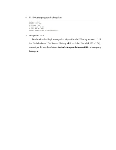 Berdasarkan hasil uji homogenitas diperoleh nilai F hitung sebesar 1,155