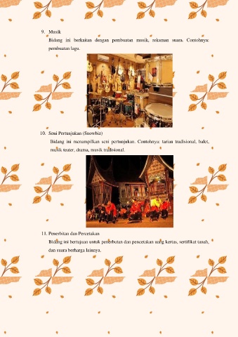 Bidang ini menampilkan seni pertunjukan. Contohnya: tarian tradisional, balet,