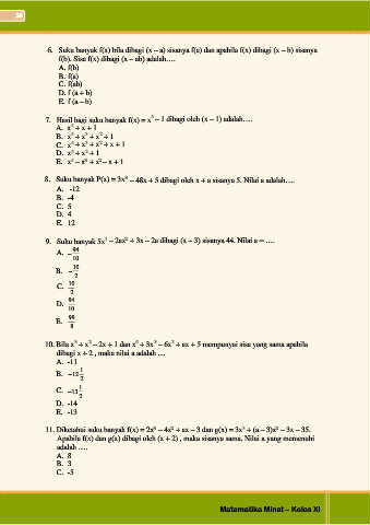 12. Diketahui suku banyak f(x) = 2x + 3x – 7x + 4x + ax + 6 jika dibagi (x – 2) hasil