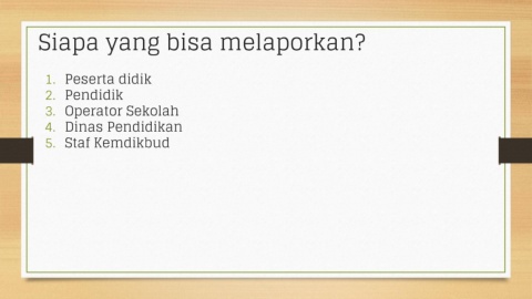 Siapa yang bisa melaporkan? 1. Peserta didik 2. Pendidik 3. Operator Sekolah 4. Dinas Pendidikan 5. Staf Kemdikbud