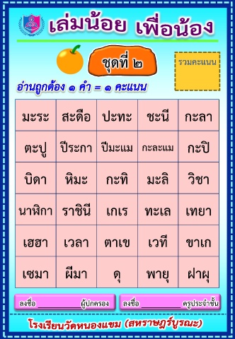 ชุดที่ ๒ รวมคะแนน มะระ สะดือ ปะทะ ชะนี กะลา ตะปู ปีระกา ปีมะแม กะละแม กะปิ บิดา หิมะ กะทิ มะลิ วิชา นาฬิกา ราชินี เกเร ทะเล เทยา เฮฮา เวลา ตาเข เวที ขาเก เซมา ผีมา ดุ พายุ ฝาผุ ลงชื่อ ___________ผู้ปกครอง ลงชื่อ __________ ครูประจ าชั้น