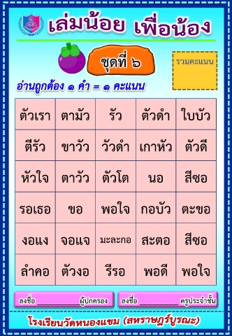 ชุดที่ ๖ รวมคะแนน ตัวเรา ตามัว รัว ตัวด า ใบบัว ตีรัว ขาวัว วัวด า เกาหัว ตัวดี หัวใจ ตาวัว ตัวโต นอ สีซอ รอเธอ ขอ พอใจ กอบัว ตะขอ งอแง จอแจ มะละกอ สะตอ สีซอ ล าคอ ตัวงอ รีรอ พอดี พอใจ ลงชื่อ ___________ผู้ปกครอง ลงชื่อ __________ ครูประจ าชั้น