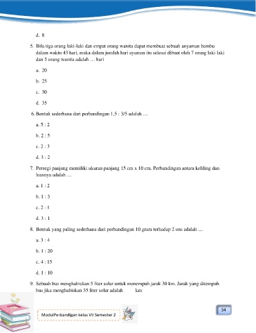 8. Bentuk yang paling sederhana dari perbandingan 10 gram terhadap 2 ons adalah ....