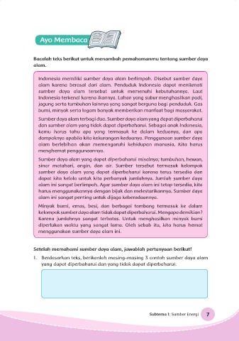 1. Berdasarkan teks, berikanlah masing-masing 3 contoh sumber daya alam