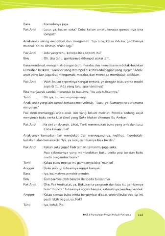 Pak Andi : Oke, Pak Andi catat, ya. Buku cerita yang unik dan lucu itu, gambarnya