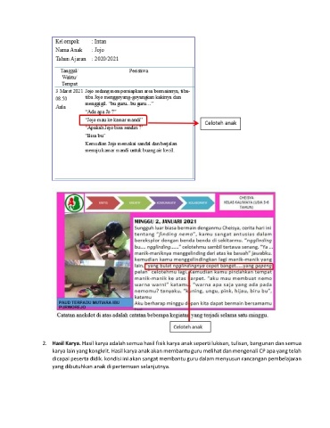 2. Hasil Karya. Hasil karya adalah semua hasil fisik karya anak seperti lukisan, tulisan, bangunan dan semua