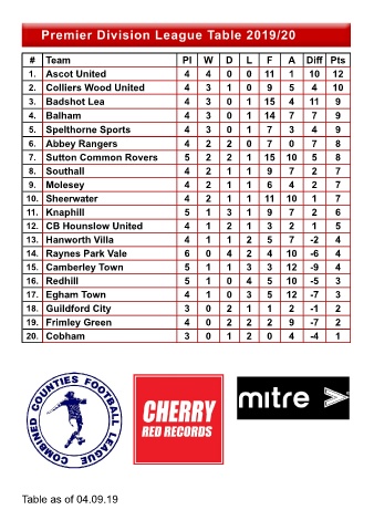 2. Colliers Wood united 4 3 1 0 9 5 4 10