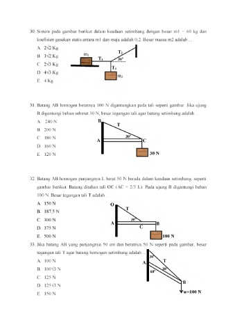 31. Batang AB homogen beratnya 100 N digantungkan pada tali seperti gambar. Jika ujung