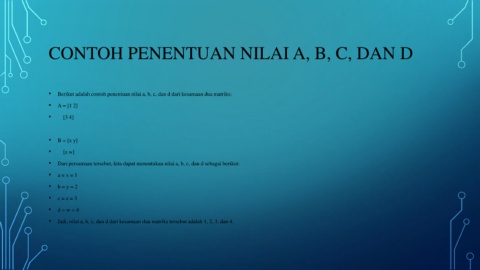 • Jadi, nilai a, b, c, dan d dari kesamaan dua matriks tersebut adalah 1, 2, 3, dan 4.