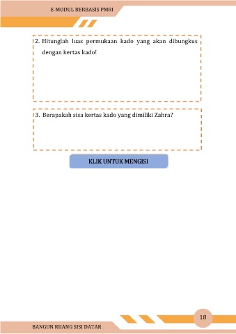 E-MODUL BERBASIS PMRI 2. Hitunglah luas permukaan kado yang akan dibungkus dengan kertas kado! 3. Berapakah sisa kertas kado yang dimiliki Zahra? KLIK UNTUK MENGISI 18 BANGUN RUANG SISI DATAR