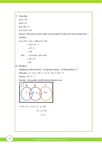 Diketahui : A = 8, B = 20, C = 15, S = 30, A ∩ B = 15