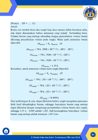 Kemudian, untuk pemuaian volume pada tangki diperoleh: