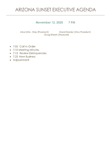 ARIZONA SUNSET EXECUTIVE AGENDA November 12, 2020 7 PM Alba Ortiz - Diaz (President) David Kreider (Vice President) Doug Sheets (Treasurer) • 7:05 Call to Order • 7:10 Meeting Minutes • 7:15 Review Delinquencies • 7:25 New Business • Adjournment