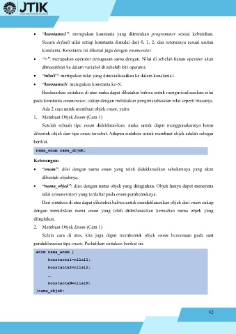 dibentuk objek dari tipe enum tersebut. Adapun sintaksis untuk membuat objek adalah sebagai