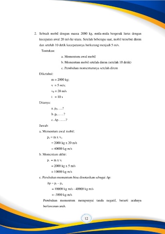 2. Sebuah mobil dengan massa 2000 kg, mula-mula bergerak lurus dengan