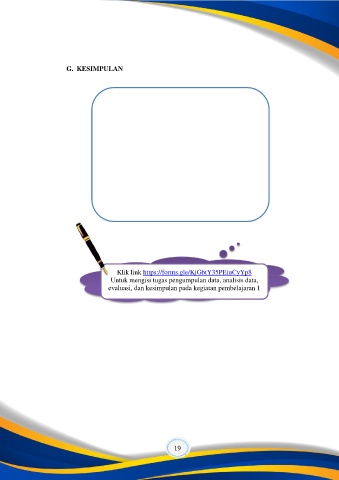 G. KESIMPULAN Klik link https://forms.gle/KjGbtY35PEiuCyYp8 Untuk mengisi tugas pengumpulan data, analisis data, evaluasi, dan kesimpulan pada kegiatan pembelajaran 1 19