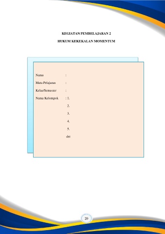 KEGIATAN PEMBELAJARAN 2 HUKUM KEKEKALAN MOMENTUM Nama : Mata Pelajaran : Kelas/Semester : Nama Kelompok : 1. 2. 3. 4. 5. dst 20