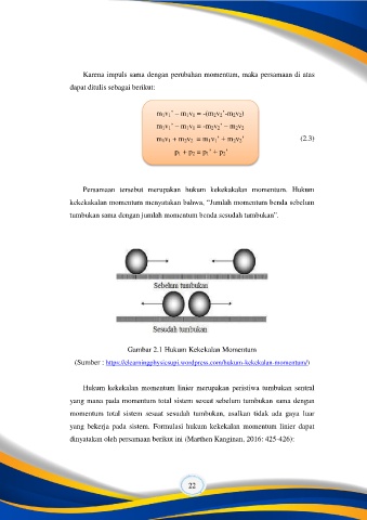 kekekakalan momentum menyatakan bahwa, “Jumlah momentum benda sebelum