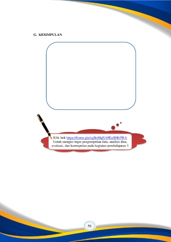 G. KESIMPULAN Klik link https://forms.gle/xgBoMqNA9EuBH65WA Untuk mengisi tugas pengumpulan data, analisis data, evaluasi, dan kesimpulan pada kegiatan pembelajaran 3 56