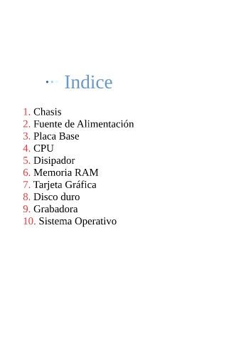 ··· Indice 1. Chasis 2. Fuente de Alimentación 3. Placa Base 4. CPU 5. Disipador 6. Memoria RAM 7. Tarjeta Gráfica 8. Disco duro 9. Grabadora 10. Sistema Operativo