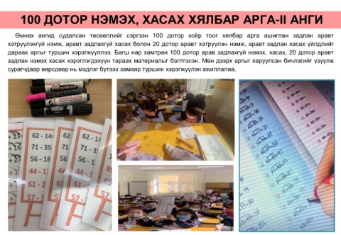 дараах аргыг туршин хэрэгжүүллээ. Багш нар хамтран 100 дотор арав задлахгүй нэмэх, хасах, 20 дотор аравт