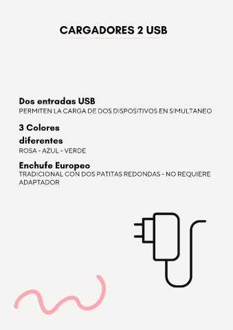 CARGADORES 2 USB Dos entradas USB PERMITEN LA CARGA DE DOS DISPOSITIVOS EN SIMULTANEO 3 Colores diferentes ROSA - AZUL - VERDE Enchufe Europeo TRADICIONAL CON DOS PATITAS REDONDAS - NO REQUIERE ADAPTADOR