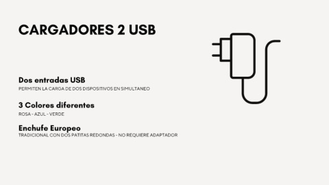 CARGADORES 2 USB Dos entradas USB PERMITEN LA CARGA DE DOS DISPOSITIVOS EN SIMULTANEO 3 Colores diferentes ROSA - AZUL - VERDE Enchufe Europeo TRADICIONAL CON DOS PATITAS REDONDAS - NO REQUIERE ADAPTADOR