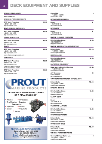 8 DECK EQUIPMENT AND SUPPLIES ANCHOR WINDLASSES www.lofrans.com ANCHORS FOR SUPERYACHTS BFG Yacht Provisions +30 210 220 1277 bfg-provisions.com BOAT FENDERS AND BUOYS BFG Yacht Provisions +30 210 220 1277 bfg-provisions.com CHAFE PROTECTION BFG Yacht Provisions +30 210 220 1277 bfg-provisions.com DAVITS BFG Yacht Provisions +30 210 220 1277 bfg-provisions.com www.atlascarbonproducts.com GANGWAYS BFG Yacht Provisions +30 210 220 1277 bfg-provisions.com LASHING EQUIPMENT BFG Yacht Provisions +30 210 220 1277 bfg-provisions.com 18, 20 18, 20 18, 20 18, 20 18, 20 18, 20 Cargo Aids +44 (0)1424 205140 www.drallim.com LIFE JACKET SUPPLIERS Dacon +47 21 06 35 10 daconrescue.com LIFE RAFTS Dacon +47 21 06 35 10 daconrescue.com MARINE CLEANING PRODUCTS BFG Yacht Provisions +30 210 220 1277 bfg-provisions.com MARINE GRADE OUTDOOR FURNITURE Dolphin Sails +44 (0)1255 243366 www.dolphinsails.com MOORING LINES BFG Yacht Provisions +30 210 220 1277 bfg-provisions.com NAVIGATION EQUIPMENT Zener Marine Electrical Services +44 (0) 7715 966 884 www.zener-mes.com AST Networks 9 31 31 18, 20 IFC, 10 18, 20 25, 30 29 IFC, 10 18, 20 31 18, 20 IFC, 10 IFC, 10 8 Gemmell & Prout Aug 2017.qxp_Gemmell & Prout 13/10/2017 13:06 Page 1 01493 440011 ast-networks.com OUTDOOR FURNITURE FOR SUPERYACHTS Dolphin Sails +44 (0)1255 243366 www.dolphinsails.com RUNNING RIGGING BFG Yacht Provisions +30 210 220 1277 bfg-provisions.com SAFETY GEAR Dacon +47 21 06 35 10 daconrescue.com STAIRS AND LADDERS BFG Yacht Provisions +30 210 220 1277 bfg-provisions.com SUN AWNING SYSTEMS Dolphin Sails +44 (0)1255 243366 www.dolphinsails.com SUPERYACHT SAILS Dolphin Sails +44 (0)1255 243366 www.dolphinsails.com WINCHES FOR SUPERYACHTS Gemmell & Prout Marine Ltd. +44 (0)1482 329600 www.proutmarine.co.uk DESIGNERS AND MANUFACTURERS OF A FULL RANGE OF: l Winches l Windlasses l Tow Winches l Capstans Powered by l Hydraulic l Electric l Diesel l Pneumatic l Manual GEMMELL & PROUT MARINE LTD Swann Street, Hull HU2 0PH Tel: +44 (0)1482 329600 Email: info@proutmarine.co.uk Website: www.proutmarine.co.uk